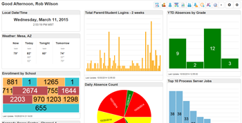Role-based dashboards make it easy to show every user the most relevant information. Administrator and principal dashboards can show up-to-the-minute insights into enrollment changes, absence counts, and more, while teacher dashboards keep tabs on grade trends, weather, education chats on Twitter, or favorite teaching blogs.