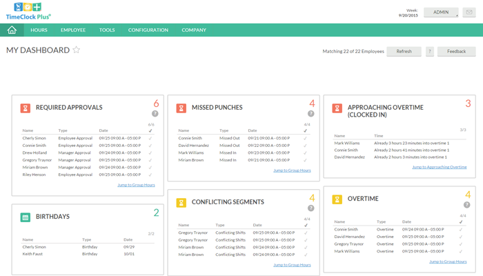 See your most important labor and attendance information on a single screen. TimeClock Plus v7 Professional can be customized with powerful widgets for approvals, approaching overtime, missed punches, birthdays, anniversaries, time off requests, and more. Let the TimeClock Plus v7 Dashboard be the window to your workforce, allowing you to clear tasks from your to-do list with a single click.